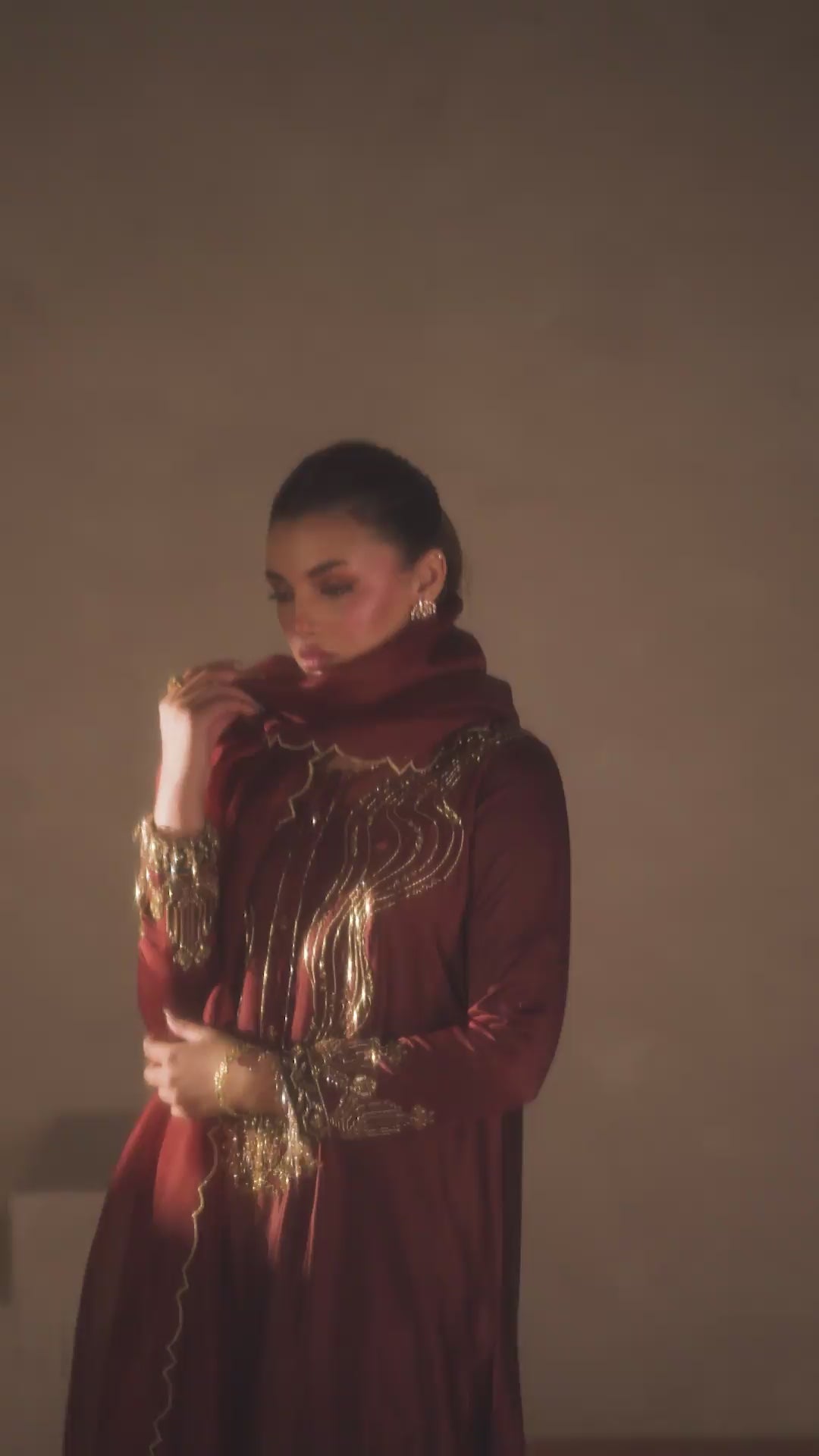 'Suffused in brown ombre, the charmeuse silk elongated a line silhouette is a study in understated opulence. Gold crystal and pipe work unfurl across the sleeves, and neckline, their intricacy elevating the ensemble . Paired with matching cigarette trousers and a pure organza scalloped dupatta - Brown Ombre channels elegance.