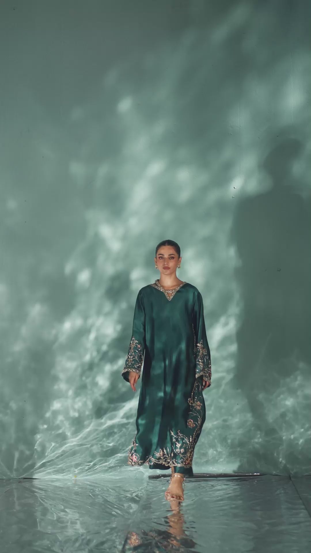 'Celia is a Teal Colour long shirt with Fusion mix Embrodery and Embellishment Technique. Adorred with Zardosi, cutdana, coloured sequin and Saroski paird with quellottes and scalloped hem.