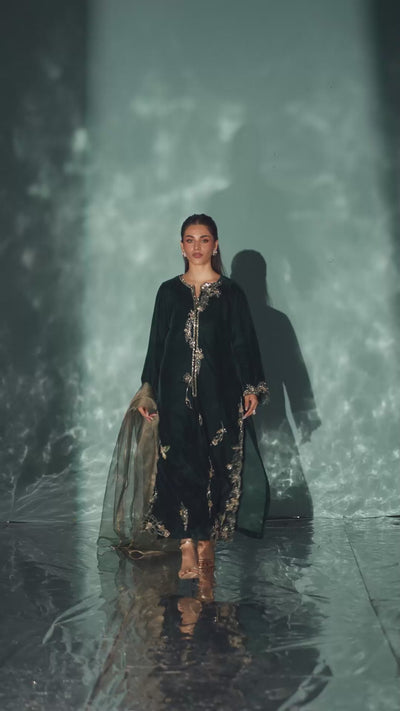 Elegant and sophisticated this deep shade of emerald is cut from the softest velvet. The shirt features sequence, cut dana, Swarovski and zardozi detailing. The ensemble is completed with a matching silk trousers and net dupatta.