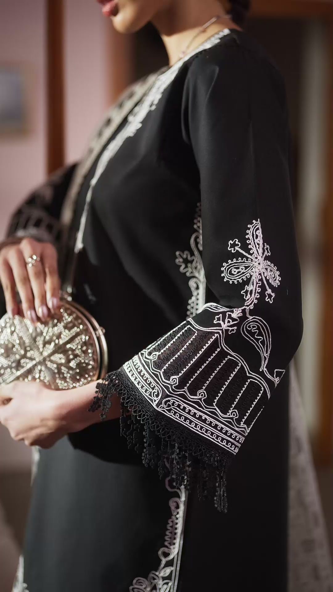 A perfect blend of elegance and refinement, Ivory Ink is a three-piece lawn ensemble. The lawn shirt is adorned with intricate dori work and complemented by delicate organza patch details on the sleeves. It is paired with a cotton cambric trouser and a self-organza dupatta featuring lace and subtle block-print accents, finished with resham embroidery on the organza border, offering a graceful and elevated finish.