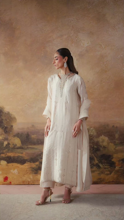 An expression of refined elegance, this ivory sheesha silk ensemble is delicately adorned with intricate sequin and Swarovski embellishments that shimmer with understated grace. Featuring a beautifully cutout neckline, the silhouette is elevated with fine craftsmanship and timeless sophistication. Paired with a pure organza dupatta accented with sequin spray and finished with sheesha silk borders, this ensemble effortlessly embodies modern classic charm.