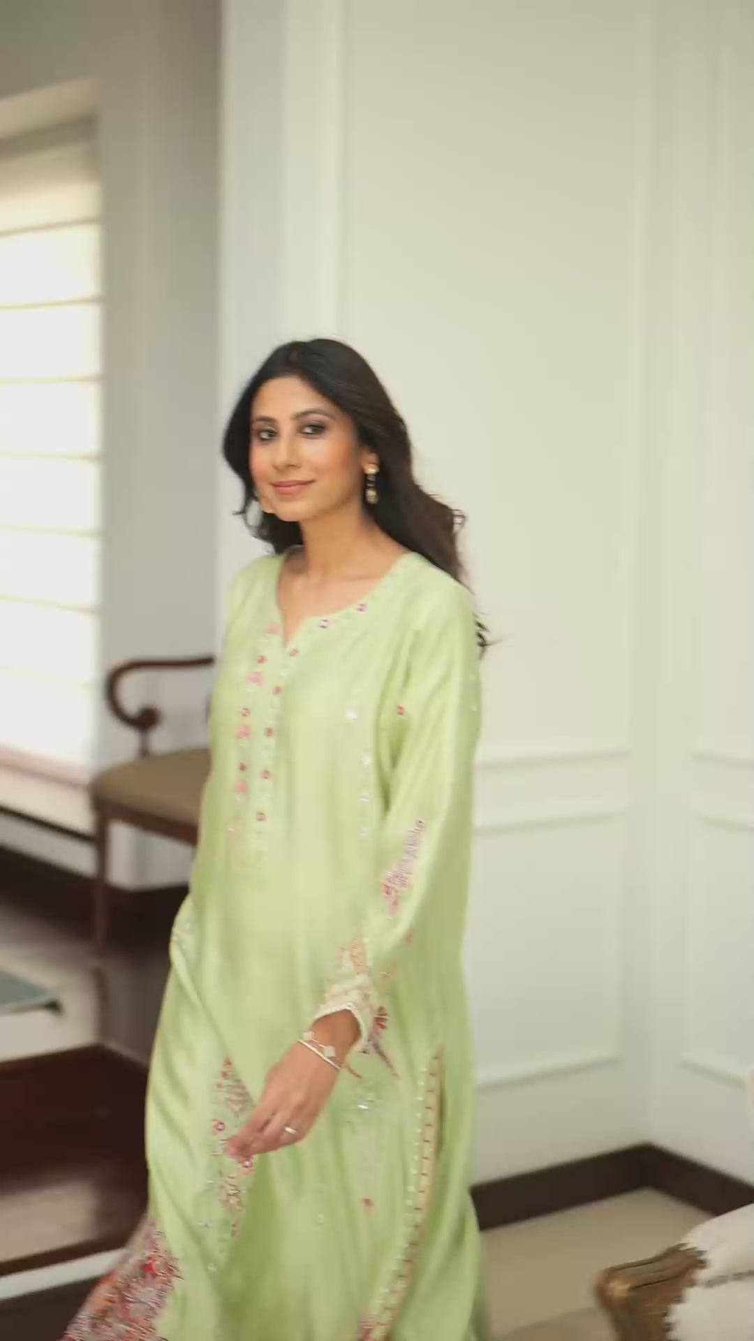 An apple green embroidered canvas, featuring applique and mirror work with embroidery details all over, the Jade kurta is paired with scalloped culottes, intricately designed with attention to detail making it the finest ensemble for you.