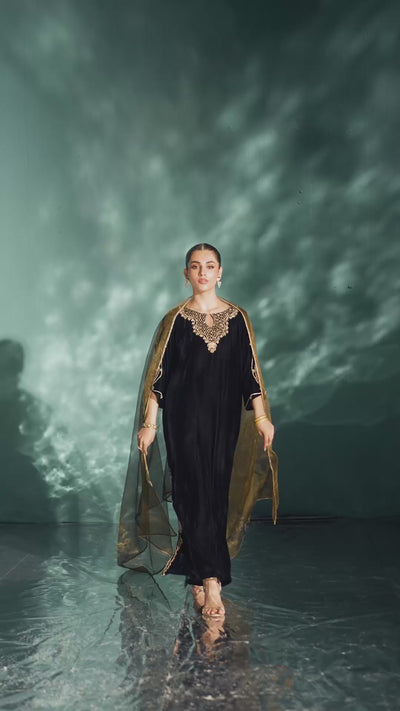 Tailored from a deep ink black hued velvet, the shirt is rendered with contrasting gold zardozi embroidery. The glistening sequence, Swarovski and cut daana details on the keyhole neckline artistically ties in the old world elegance. Paired with matching trousers cut from silk with a rich sheen.