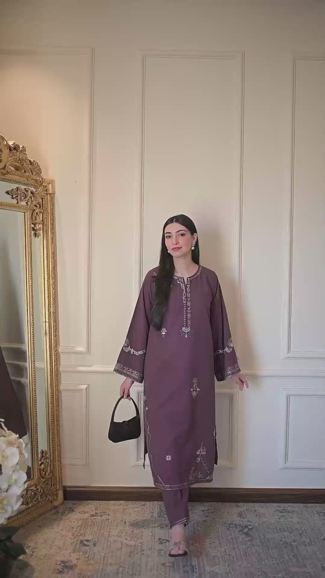 Mulberry from our Karandi '25 Collection is an embroidered two piece stitched ensemble paired with straight pants.