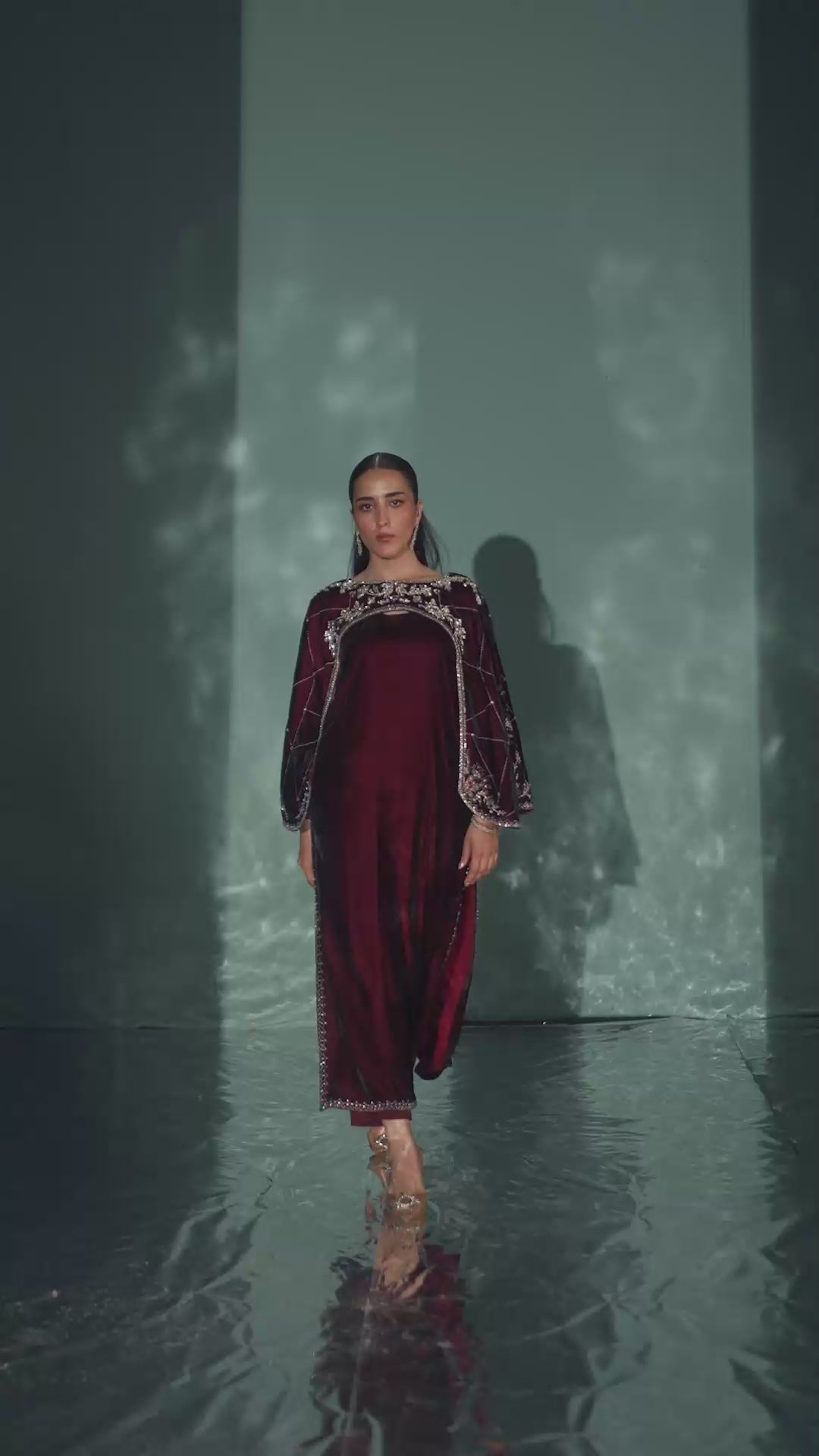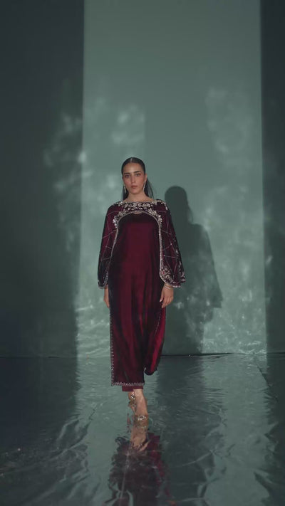 Cut from velvet this deep plum shirt is adorned with a sequence, cut daana, Swarovski and stone work along the neck line and dramatic bell sleeves. It is paired with matching silk straight trousers.
