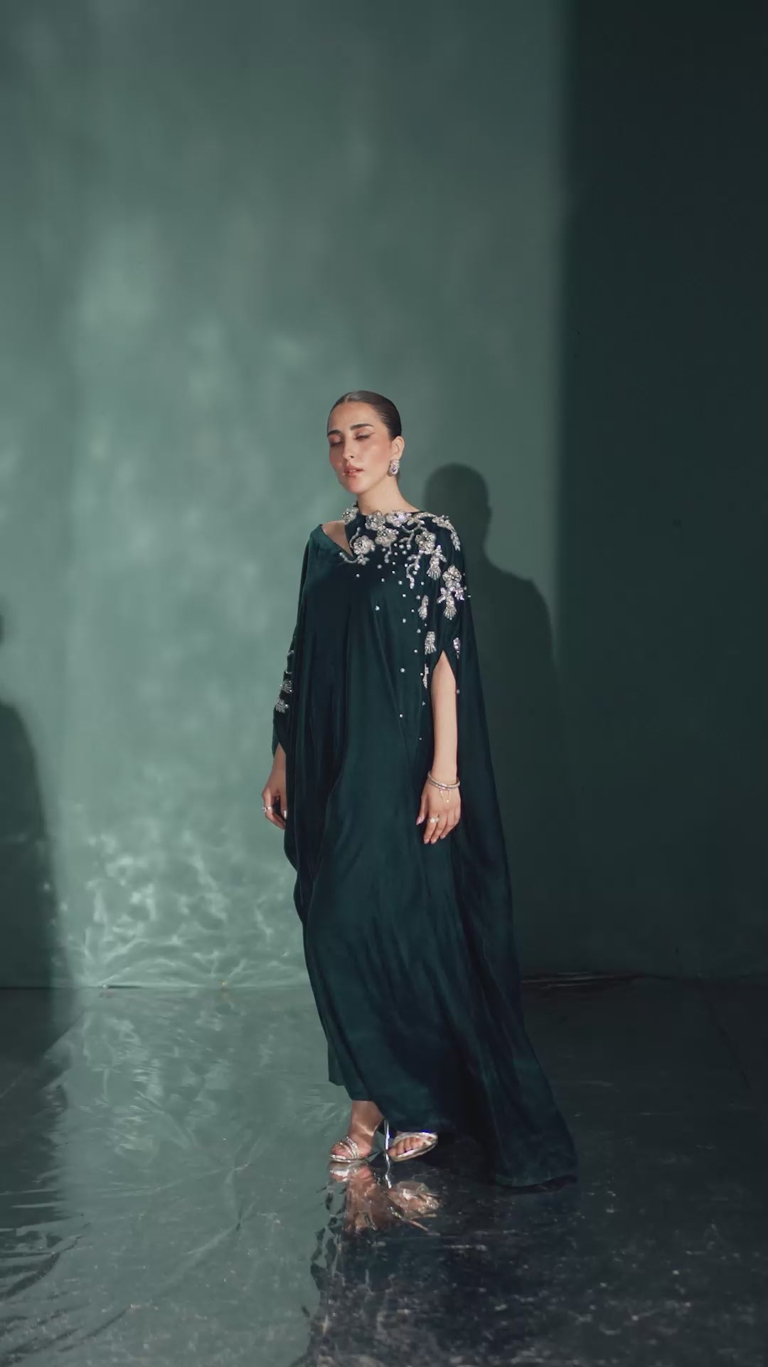 Exuding a touch of sophistication that transcends trends, the Swarovski and stone work meticulously embroidered neckline takes centre stage in a teal hued kaftan cut from velvet. The rich texture of velvet is amplified with sequence and cut daana. Paired with a matching straight trouser for an effortlessly festive feel.