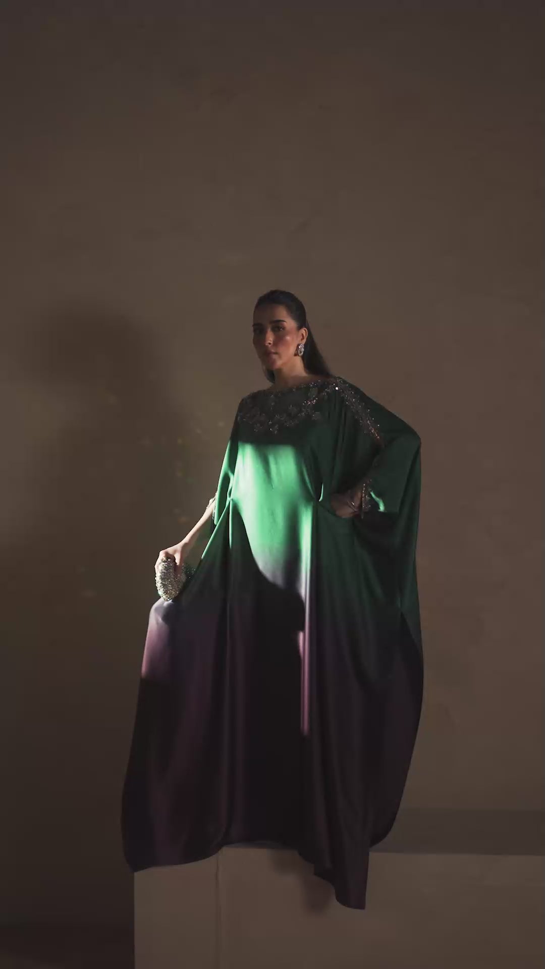 A luminous drape in ombre dyeing, this loose fit kaftan shimmers with crystal and pipe work. The organza appliquéd neckline add a note of dramatic grace. Matching cigarette trousers complete the look with radiant poise.